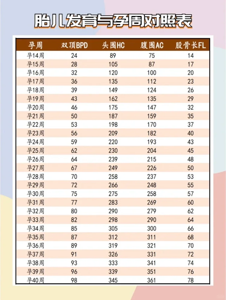 每次做B超,医生都会告诉宝宝的对比值,根据这个表格可以清楚的了解宝宝的生长情况。 🍓BPD:双顶径宝宝头部从左到右的最长部分,可以根据这个来判断孕妇适合那种生产方式; 🍓HC:头围宝宝环头一周的长度,宝宝的头围跟标准值在上下一周之内,都是正常的:<br> 🍓AC:腹围宝宝腹部一周的长度,...