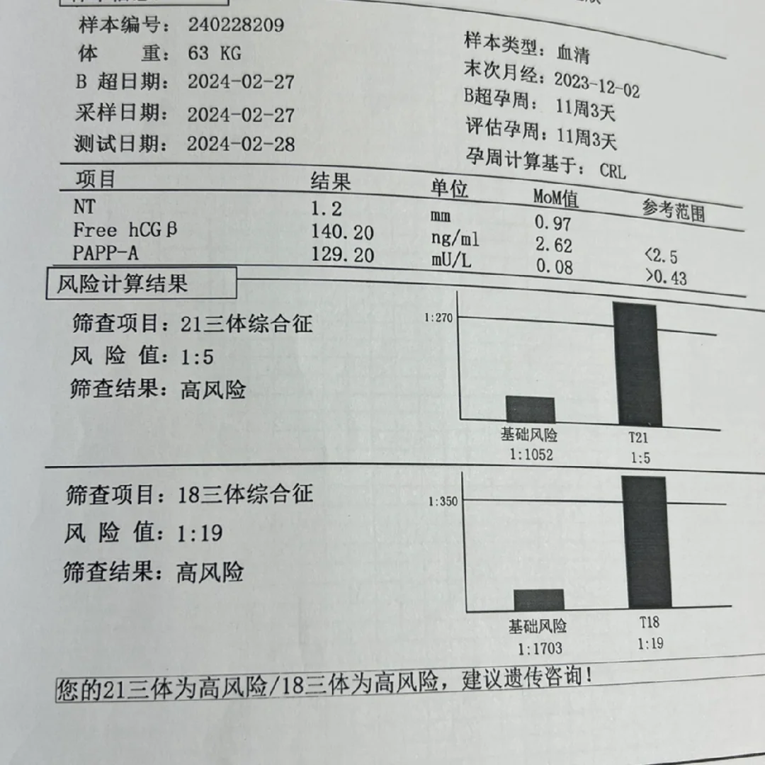 早糖18三体1:19、21三体1:5超高风险,做了无创plus还是高风险 z值8.9多 天都塌下来了 每天哭 哭到眼痛眼肿 哭到鼻塞呼吸不了 哭到偏头痛 睡觉潜意识里都是这事 行尸走肉 浑浑噩噩 一会想通了一会又想不通 医生说翻盘率很低 无创的准确率很高 抱着最坏的结果做了羊穿 fish...
